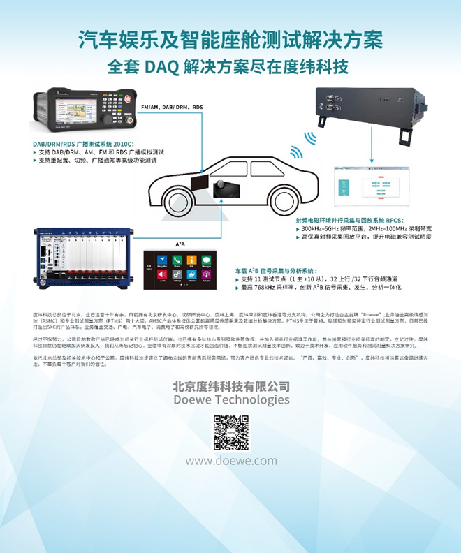 度緯科技(Doewe Technologies)總部位于北京,業(yè)已運營十年有余,目前擁有北京研發(fā)中心、成都研發(fā)中心、度緯上海、度緯深圳和度緯香港等分支機構(gòu)。公司全力打造自主品牌“Doewe”,業(yè)務涵蓋高級傳感測控(ASMC)和專業(yè)測試測量方案(PTMS)兩個大類。AMSC產(chǎn)品體系提供全套的高精度傳感采集及數(shù)據(jù)分析解決方案。PTMS專注于音頻、視頻和射頻類特定行業(yè)測試測量方案,目前已經(jīng)打造出5XC的產(chǎn)品體系,業(yè)務覆蓋交通、廣電、汽車電子、消費電子和高校研究所等領域。