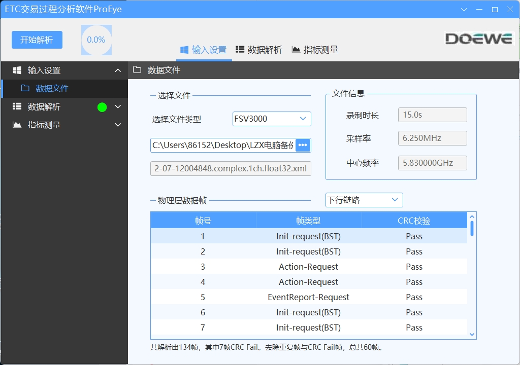 ProEye軟件能夠對錄制下來的射頻文件進行解析,支持解析射頻層指標、應用層及設備應用層的關鍵交互語句和數(shù)據(jù)特征。以下展示的是軟件的實際測試界面。