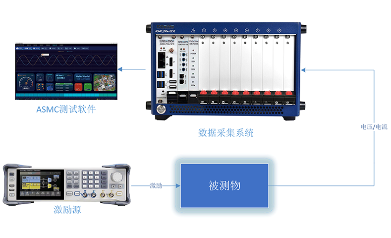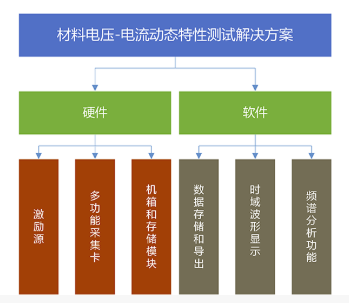 本方案旨在為材料提供電壓-電流動態(tài)特性測試解決方案。通過激勵源對材料施加特定波形的電壓或電流激勵,使用數(shù)據(jù)采集系統(tǒng)采集經(jīng)過材料后的電壓、電流等信號變化,以此分析材料的動態(tài)特性。通過對電壓和電流信號的精準(zhǔn)采集,可以實(shí)時監(jiān)測材料在不同電氣條件下的反應(yīng),幫助用戶深入了解材料在實(shí)際工作狀態(tài)下的性能表現(xiàn)。這一過程對于評估材料的導(dǎo)電性、熱穩(wěn)定性和抗壓能力等特性至關(guān)重要,為材料的優(yōu)化與設(shè)計(jì)提供科學(xué)數(shù)據(jù)支持。測試系統(tǒng)整體結(jié)構(gòu)圖如下: