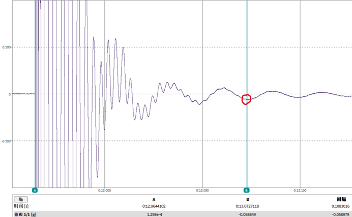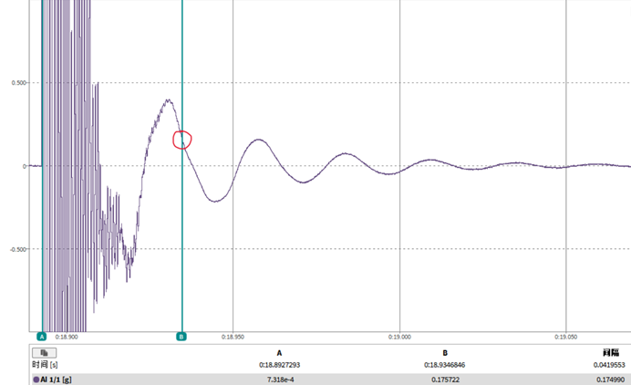 i 圖片分析:從兩張圖片中可以看出,我們在相同條件下進(jìn)行了對比,選取的時(shí)間間隔均為約100ms,波形幅度值均為±1g,以保證完全相同的測試環(huán)境。紅圈標(biāo)記的位置代表了高頻振動分量消失的時(shí)刻。盡管兩個減振棒在該位置均達(dá)到了高頻振動的消失狀態(tài),但阻尼特性差的減振棒所需的衰減時(shí)間顯著長于阻尼特性好的減振棒,這表明其對高頻振動的抑制能力較弱,而阻尼特性好的減振棒在更短時(shí)間內(nèi)能夠消除高頻成分并恢復(fù)平穩(wěn)狀態(tài),從而表現(xiàn)出更優(yōu)異的減震效果。