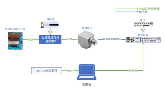 刀具在受到外力激勵時(shí),會產(chǎn)生振動。振動信號中包含了刀具材料、結(jié)構(gòu)設(shè)計(jì)和制造工藝等方面的信息。阻尼性能是衡量刀具質(zhì)量的重要指標(biāo)之一,良好的阻尼效果意味著刀具在受到外力作用時(shí),能夠更快地吸收并衰減振動能量,從而保持加工過程的穩(wěn)定性和精度。我們則可以利用這一特點(diǎn),根據(jù)不同阻尼效果的刀具振動時(shí)長不同,來實(shí)現(xiàn)快速準(zhǔn)確辨別刀具質(zhì)量的好壞。測試框圖如下圖所示: