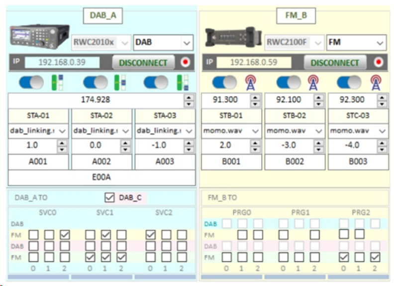 通過(guò)以太網(wǎng)的方式將此應(yīng)用程序與每個(gè)設(shè)備連接后即可在此模塊中查看設(shè)備的連接狀態(tài)。每個(gè)設(shè)備有3個(gè)開關(guān),根據(jù)所連接的設(shè)備或傳輸方式的不同,開關(guān)所控制的功能也不同。當(dāng)連接RWC2010C并處于DAB或DRM模式下時(shí),開關(guān)表示總成信號(hào)中有3個(gè)業(yè)務(wù),每個(gè)業(yè)務(wù)都可單獨(dú)打開或者關(guān)閉;當(dāng)連接RWC2100F時(shí),開關(guān)表示3個(gè)FM發(fā)射機(jī)。值得一提的是,RWC2010C在DAB模式下一個(gè)總成信號(hào)中可以提供最多64個(gè)業(yè)務(wù),在DRM模式下一路復(fù)用可接入4個(gè)業(yè)務(wù),軟件中為了便于測(cè)試均只設(shè)置3個(gè)業(yè)務(wù)。此外,所連接的設(shè)備不同,軟件中顯示的參數(shù)以及屬性也會(huì)有所不同。