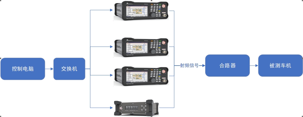 首先進(jìn)行硬件設(shè)備的連接準(zhǔn)備。使用網(wǎng)線與交換機(jī)將控制電腦與三臺(tái)RWC2010C與一臺(tái)RWC2100F相連接(以下將使用設(shè)備1、設(shè)備2、設(shè)備3分別表示三臺(tái)RWC2010C,使用設(shè)備4表示RWC2100F),在控制軟件上確認(rèn)設(shè)備的接通狀態(tài)。將四臺(tái)設(shè)備輸出的信號(hào)經(jīng)過(guò)合路器后輸入給被測(cè)車機(jī)進(jìn)行測(cè)試。