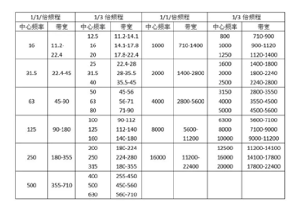 參考圖5倍頻程表格,判斷其屬于哪個(gè)帶寬內(nèi),以此作為依據(jù)計(jì)算一個(gè)倍頻程帶寬內(nèi)的信號(hào)的平均功率,以圖3圖4為例,1.5kHz屬于1400Hz-2800Hz范圍內(nèi),因此我們計(jì)算1400Hz-2800Hz頻率范圍內(nèi)的信號(hào)的平均聲壓級(jí)為P0。