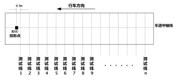 2)如圖1所示,從RSU的投影點后0.5米處在待測試區(qū)域內等間距(不大于1米)標記若干條測試線;