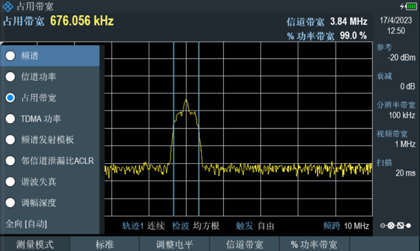 2)將測試天線與頻譜分析儀相連接,在頻譜分析儀上設置測試相關參數并將頻譜分析儀調至占用帶寬測試功能;