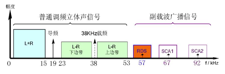 其中,RDS (Radio Digital System) 是由歐洲廣播聯(lián)盟 (EBU)于1984年提出的技術(shù)標(biāo)準(zhǔn)EBU 3244。該技術(shù)充分利用了現(xiàn)有調(diào)頻廣播的帶寬,不需要分配專門的帶寬,57KHz的副載波數(shù)據(jù)信號疊加在調(diào)頻節(jié)目頻段上,在接收音頻信號的同時可收到數(shù)字信號。數(shù)據(jù)內(nèi)容包括電臺名稱、節(jié)目類型、交通信息、標(biāo)準(zhǔn)時間、廣告信息等。現(xiàn)在常用的RDS模式,一般是指利用FM廣播的副載波攜帶數(shù)據(jù)資料的一種工作方式,如圖二所示。