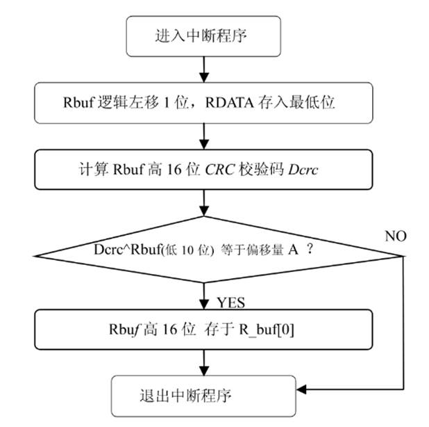 根據(jù)該多項式對高16位數(shù)據(jù)進(jìn)行CRC校驗(yàn)碼計算得到校驗(yàn)碼Drc再和低10位數(shù)據(jù)做異或運(yùn)算,如果該運(yùn)算結(jié)果等于數(shù)據(jù)塊1的同步字偏量A,則表明數(shù)據(jù)塊1的數(shù)據(jù)接收正確完成。Rbuf的高16位數(shù)據(jù)就是數(shù)據(jù)塊1的有效信息代碼。接收流程如圖五所示。