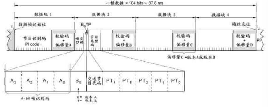 RDS的數(shù)據(jù)信號傳送是以為一個基本單元,一次有效的數(shù)據(jù)采集至少是一個完整的數(shù)據(jù)幀。一幀數(shù)據(jù)由4個數(shù)據(jù)塊組成,每個數(shù)據(jù)塊包含26比特數(shù)據(jù)位高16位是信息代碼,低10位是校驗(yàn)碼和數(shù)據(jù)塊識別號(即圖中偏移量)。數(shù)據(jù)傳輸比特率是1187.5Hz。所以一幀數(shù)據(jù)共有104比特,傳輸時間約為87.6毫秒,也就是說每秒鐘可傳送148個字節(jié)的信息,除去冗余信息,有效的信息載荷為92字節(jié)。