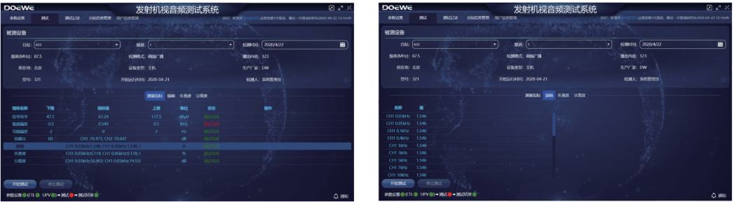 測試界面如圖4所示,選擇被測臺站和該臺站內(nèi)的某個發(fā)射機,即可進行自動化測試,支持實時查看“狀態(tài)”欄觀察當(dāng)前此測試項的狀態(tài),測試完成后結(jié)果若超過門限,將會被標(biāo)紅提示。通過子菜單可查看頻響、失真度、分離度的測試數(shù)據(jù)。