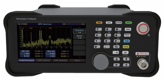 基于上述現(xiàn)象,本文將帶來一款新的針對FM/AM發(fā)射機測試的自動化測試系統(tǒng)iBroadcast,區(qū)別于傳統(tǒng)測試方法,本系統(tǒng)能夠從射頻以及音頻兩個層面進行多種指標(biāo)測試。此系統(tǒng)由自動化控制及信息管理軟件、廣播調(diào)制分析儀RWC2500A Plus和音頻分析儀A5組成。其中的廣播調(diào)制分析儀RWC2500A Plus在具備小巧體型的前提下還擁有對標(biāo)FMAB的測試功能以及性能。下文將對本套系統(tǒng)進行更詳細(xì)的介紹。