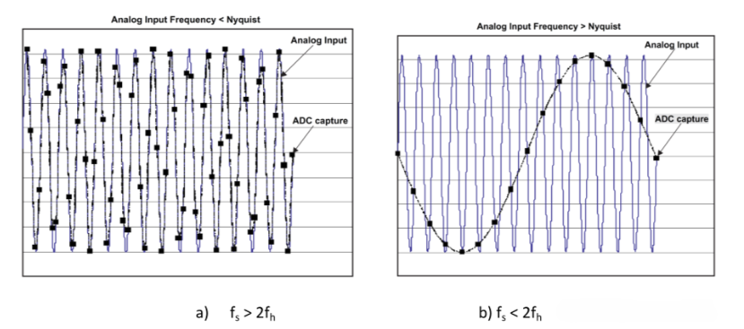 采樣率是指ADC每秒從模擬信號(hào)中采樣的次數(shù),通常以“樣本每秒”為單位。采樣率越高,數(shù)據(jù)采集系統(tǒng)能夠捕捉到的信號(hào)時(shí)間變化越精細(xì),從而提升時(shí)間分辨率。根據(jù)奈奎斯特定理,采樣率至少要是信號(hào)中最高頻率的兩倍,才能避免混疊現(xiàn)象,即高頻信號(hào)被誤認(rèn)為低頻信號(hào)的現(xiàn)象。如果采樣率低于這個(gè)要求,信號(hào)的細(xì)節(jié)將會(huì)丟失,導(dǎo)致數(shù)據(jù)失真?。