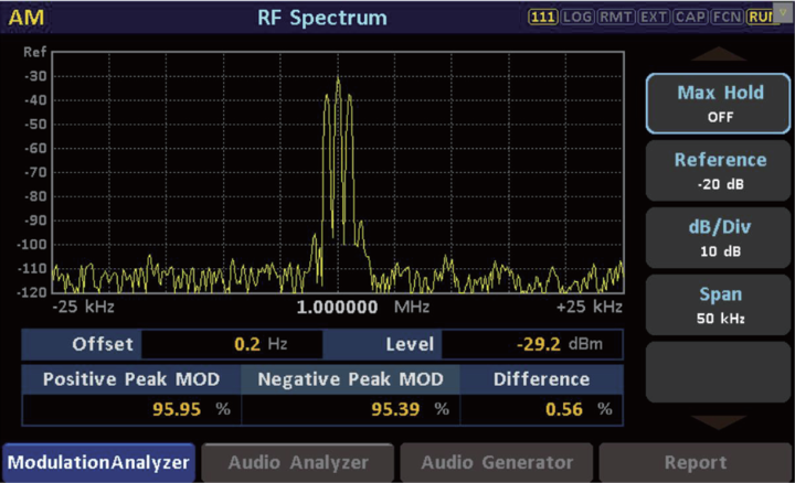 當設置好輸入給發(fā)射機的基帶音頻信號之后,可以在ModulationAnalyzer界面的RF Spectrum界面中,直接查看AM的調制度和正負調幅度,也可在音頻發(fā)生模塊直接進行讀取。