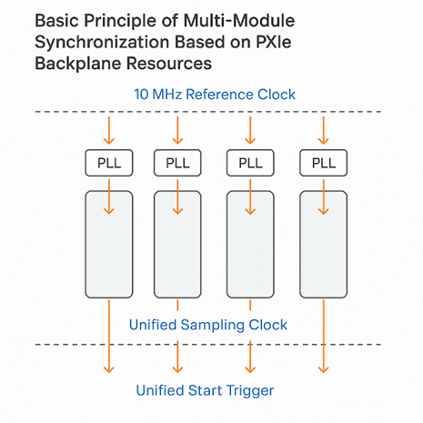 PXIe標(biāo)準(zhǔn)在機(jī)箱背板上為時(shí)鐘與觸發(fā)信號(hào)預(yù)留了豐富的硬件資源,使得多板卡同步可以在機(jī)箱內(nèi)部以較為自然的方式實(shí)現(xiàn)。從原理上看,可以概括為三個(gè)層面:首先是統(tǒng)一參考時(shí)鐘,其次是統(tǒng)一采樣時(shí)鐘,最后是統(tǒng)一啟動(dòng)觸發(fā)。典型PXIe機(jī)箱會(huì)在背板上提供10 MHz參考時(shí)鐘PXI_CLK10,以單端形式分發(fā)到所有插槽,用于傳統(tǒng)PXI模塊或作為鎖相環(huán)(PLL)的參考源;同時(shí)還會(huì)提供一組差分參考時(shí)鐘,例如100 MHz差分時(shí)鐘,以低抖動(dòng)差分形式作為高速模塊的時(shí)間基準(zhǔn)。多板卡同步的第一步就是讓各采集卡的時(shí)間基準(zhǔn)鎖定到同一參考時(shí)鐘。通常,每塊采集卡內(nèi)部的時(shí)鐘模塊會(huì)通過(guò)PLL鎖定到PXI_CLK10或PXIe差分時(shí)鐘,也可以由專用定時(shí)與同步模塊向背板注入高穩(wěn)定度參考時(shí)鐘,再由各采集卡進(jìn)行鎖定。一旦所有采集卡都使用同一參考時(shí)鐘作為“母鐘”,便可以在此基礎(chǔ)上合成各自的采樣時(shí)鐘,同時(shí)避免長(zhǎng)時(shí)間運(yùn)行中的相對(duì)漂移。