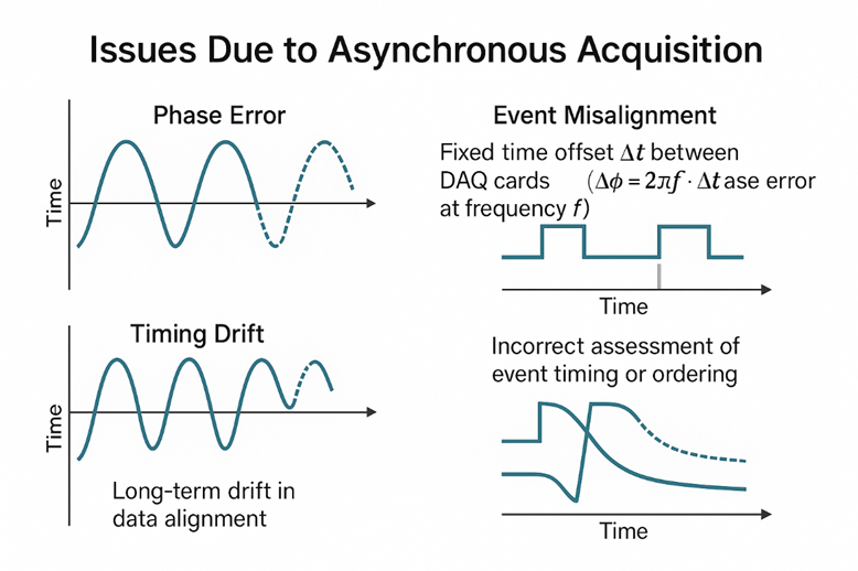 本文以PXIe平臺(tái)為基礎(chǔ),聚焦同一PXIe機(jī)箱內(nèi)多塊采集卡之間的通道同步問(wèn)題,首先介紹多板卡同步的典型應(yīng)用場(chǎng)景及面臨的挑戰(zhàn),然后分析若只保證單卡同步、板卡之間異步可能引發(fā)的系統(tǒng)級(jí)問(wèn)題,最后結(jié)合PXIe背板資源,對(duì)多板卡同步的基本原理和常見(jiàn)實(shí)現(xiàn)方案進(jìn)行論述??鐧C(jī)箱、跨機(jī)柜的分布式時(shí)間同步問(wèn)題將在后續(xù)文章中展開(kāi)。