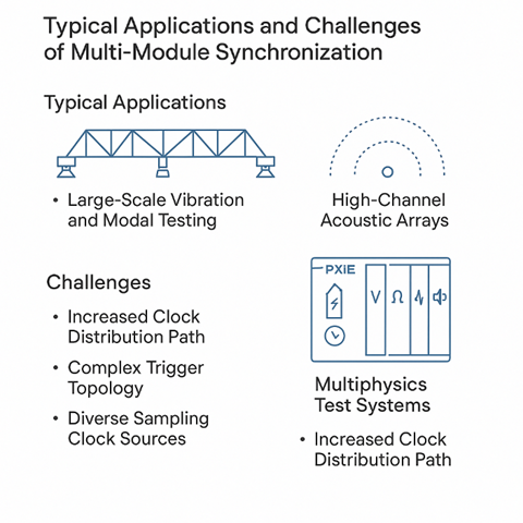 在工程實(shí)踐中,多板卡同步通常出現(xiàn)于幾類典型應(yīng)用場(chǎng)景。大規(guī)模結(jié)構(gòu)振動(dòng)與模態(tài)測(cè)試就是其中之一:在大型機(jī)械結(jié)構(gòu)、整車、機(jī)車、風(fēng)機(jī)葉片或橋梁等試驗(yàn)中,往往需要布設(shè)數(shù)量眾多的加速度、應(yīng)變與位移傳感器,單塊采集卡難以滿足通道數(shù)量需求,因此必須依靠多塊振動(dòng)采集卡協(xié)同工作。類似的情況也出現(xiàn)在高通道聲學(xué)陣列與噪聲測(cè)試中,用于聲學(xué)成像、波束形成或聲場(chǎng)重建的大型麥克風(fēng)陣列,對(duì)通道數(shù)目和相位一致性有很高要求,多塊聲學(xué)采集卡之間的采樣時(shí)刻與啟動(dòng)時(shí)間必須嚴(yán)格對(duì)齊。另一方面,多物理量聯(lián)合測(cè)試系統(tǒng)也高度依賴多板卡同步,例如在同一PXIe機(jī)箱內(nèi)集成電壓、電流、溫度、振動(dòng)和聲學(xué)等多種采集卡,對(duì)電機(jī)驅(qū)動(dòng)、電力電子裝置或機(jī)頂盒整機(jī)進(jìn)行多物理場(chǎng)聯(lián)合測(cè)試時(shí),不同類型采集卡之間必須共享統(tǒng)一時(shí)間軸,才能保證關(guān)聯(lián)分析、因果分析和事件重建的可靠性。對(duì)于圍繞 A2B 等總線協(xié)議構(gòu)建的多節(jié)點(diǎn)并行分析系統(tǒng),負(fù)責(zé)總線波形、協(xié)議事件以及環(huán)境信號(hào)的采集卡更需要保持一致的時(shí)間基準(zhǔn)與觸發(fā)邊界,才能把某一幀錯(cuò)誤、某一次節(jié)點(diǎn)重連行為與供電波動(dòng)、振動(dòng)沖擊等物理因素準(zhǔn)確對(duì)應(yīng)起來(lái)。