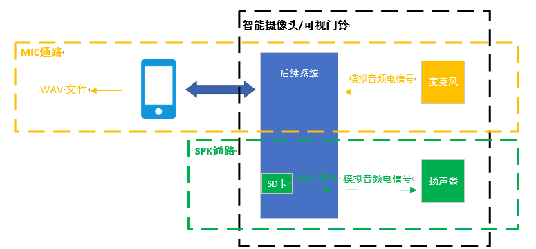 一般智能可視門鈴類產(chǎn)品的音頻系統(tǒng)可以分為麥克風音頻通路和揚聲器音頻通路。麥克風音頻通路由麥克風采集聲音信號轉換為模擬音頻電信號,后續(xù)系統(tǒng)接收到麥克風傳來的模擬音頻電信號將其轉換為數(shù)字音頻信號,通過無線網(wǎng)絡傳輸給移動終端,移動終端通過相應的APP 應用程序轉換為.wav 格式的音頻文件;揚聲器音頻通路由智能可視門鈴類產(chǎn)品的 SD 卡或者本機內存存儲的.wav 文件,轉換為模擬音頻電信號傳輸?shù)綋P聲器,揚聲器接收到模擬音頻電信號轉換為聲音信號發(fā)送出去。