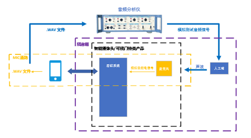 針對整機測試,測試儀器選擇專業(yè)音頻分析儀加人工嘴,可提供模擬、數(shù)字音頻測試信號和聲波信號,并且測試過程中要將人工嘴和被測系統(tǒng)(產(chǎn)品)裝入專業(yè)隔音箱中,避免環(huán)境音影響測試系統(tǒng)。專業(yè)音頻分析儀發(fā)送測試聲波信號給被測系統(tǒng)(產(chǎn)品),被測系統(tǒng)輸出.wav 格式的音頻文件給專業(yè)音頻分析儀,形成閉環(huán)的測試系統(tǒng)。