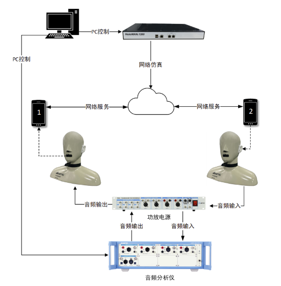 確認(rèn)被測(cè)物之間保持正常的音頻連接,音頻分析儀連接至功放電源再連接至兩個(gè)人工頭,人工頭用于輸出/采集音頻,將網(wǎng)絡(luò)損傷仿真儀接入被測(cè)物所處的網(wǎng)絡(luò)環(huán)境中,音頻分析儀以及網(wǎng)絡(luò)損傷仿真儀均使用PC進(jìn)行控制,測(cè)試前需使用音頻分析儀中的“DUT Delay”功能測(cè)試傳輸鏈路中的延時(shí);