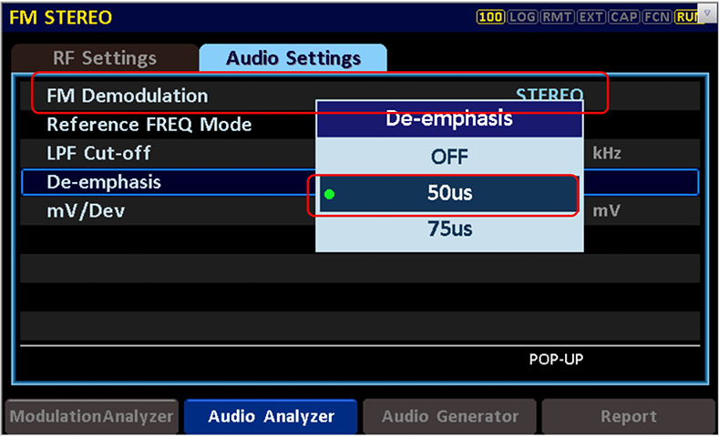 1、若為FM 發(fā)射機,在Audio Analyzer的上拉菜單中進入Audio Settings界面,將FM Demodulation設(shè)置為STEREO,De-emphasis設(shè)置為50us,與發(fā)射機的預(yù)加重參數(shù)保持匹配。