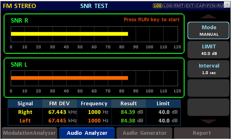 2、設(shè)置完成后,在上拉菜單中選擇 SNR界面,在界面右側(cè)Mode設(shè)置為AUTO,REF FREQ設(shè)置為1kHz,Ref Port根據(jù)連接接口選擇UNBAL/BAL/DIG,按下右側(cè)按鍵區(qū)RUN,等待幾秒即可在Result處讀取SNR測試值。