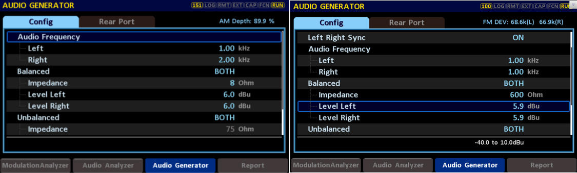 2、在此步驟中,用戶可調(diào)節(jié)音頻信號的電平和頻率,測試調(diào)制度時一般以1KHz音頻信號為主。設(shè)置好頻率之后可在此界面調(diào)整音頻電平的大小,調(diào)整同時可觀察到右上角,AM模式下確保AM Depth在100%左右,F(xiàn)M模式下確保FM DEV(L)(R)在67.5kHz左右。