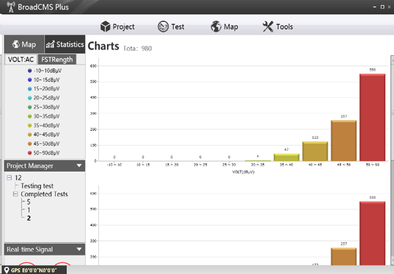 場強(qiáng)覆蓋測試系統(tǒng)由射頻功率測試儀器(例如:RSA2055A)、GPS、主控電腦和BroadCMS場強(qiáng)覆蓋測試軟件四部分組成。