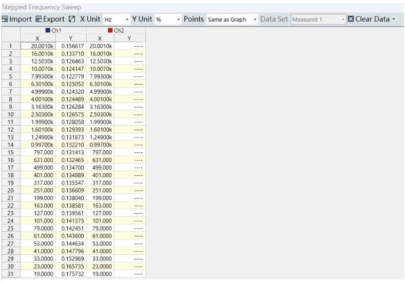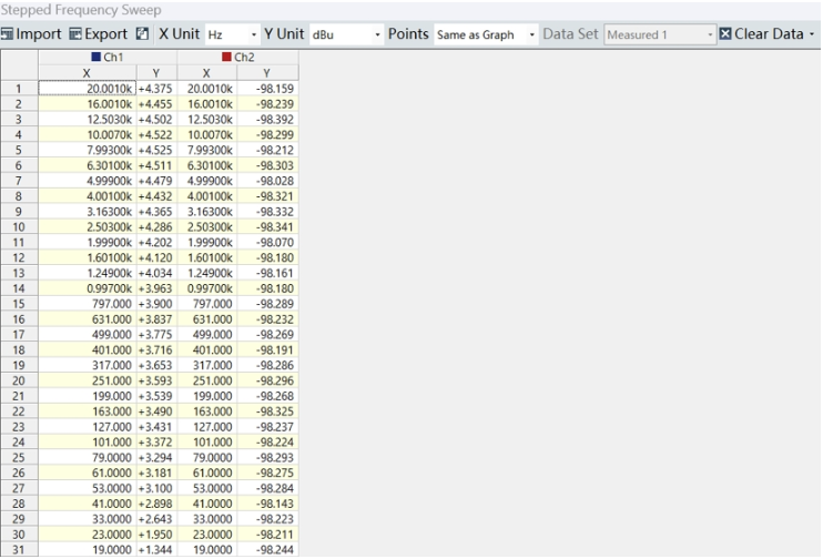 如圖8所示,可查看具體不同頻點處的總諧波失真加噪聲值表格,也可將數(shù)據(jù)導(dǎo)出。