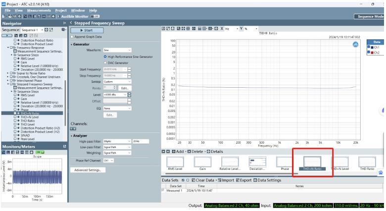 測試總諧波失真加噪聲也可在頻率步進掃描測試功能中完成,如圖7所示在結(jié)果顯示處選擇THD+N Ratio,按照測試方法配置參數(shù)后點擊Start即可得到總諧波失真加噪聲隨頻率變化的曲線。