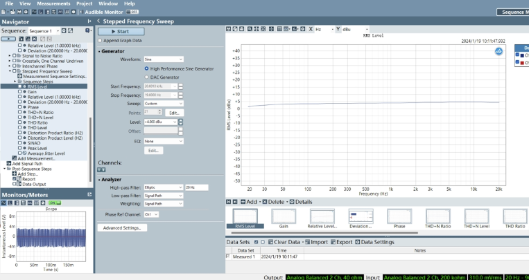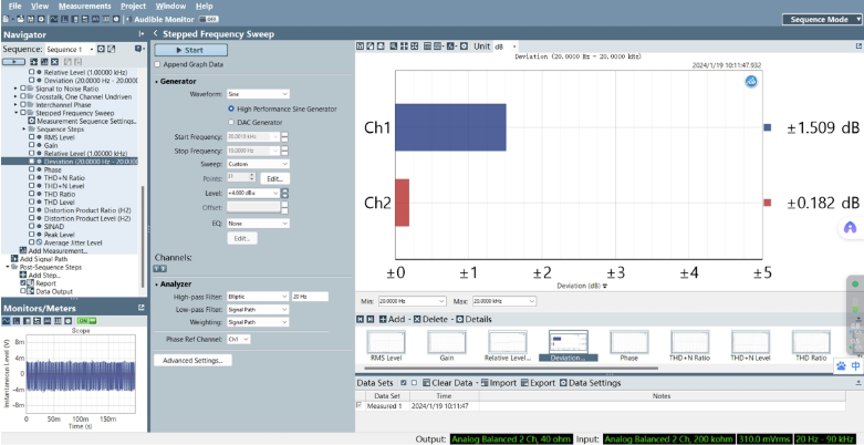使用音頻分析儀中的頻率步進掃描(Stepped Frequency Sweep)功能即可完成此項指標的測試,如圖4所示,按照方法要求設(shè)置參數(shù)后點擊Start即可得到電平隨頻率變化的曲線。