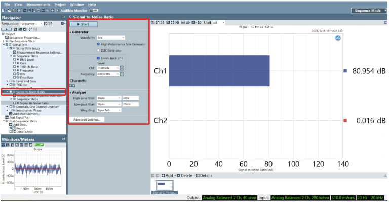 使用音頻分析儀自帶的信噪比測量功能,在滿足標準規(guī)范的測試原理下可實現(xiàn)一鍵測試。下圖所示為信噪比測試界面,按照標準要求設(shè)置濾波器、輸出信號頻率以及電平后點擊start即可得到信噪比測量值S/N=80.954dB,滿足Ⅰ級標準要求。