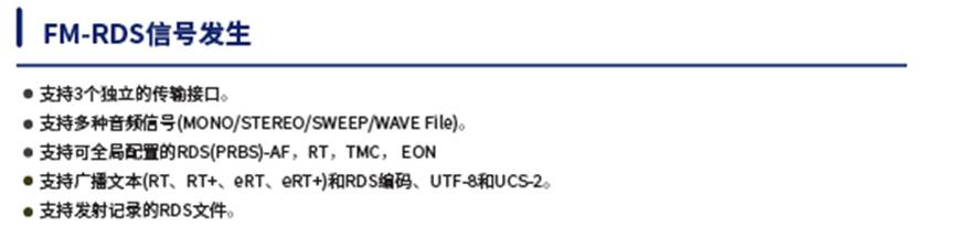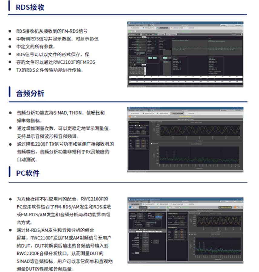 針對FM-RDS系統(tǒng)測試,我司的RWC2100F設(shè)備可完全滿足 RDS發(fā)射機和RDS接收機的相關(guān)測試,為廣大廠商和高校研究所提供了豐富的儀器便利。