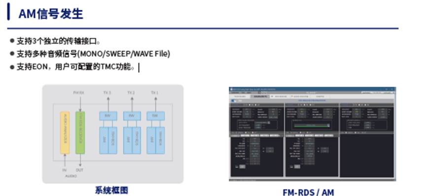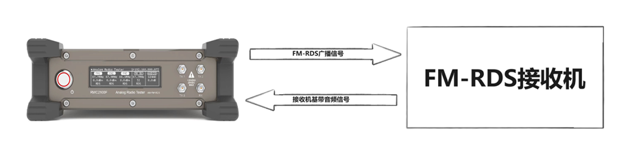 測試對象為FM-RDS的接收機,使用我司的RWC2100F可輸出標(biāo)準(zhǔn)的FM-RDS信號,并且具備可編輯的RDS信息功能,從而實現(xiàn)全面可控的接收機功能測試。并且我司的RWC2100F具備音頻分析的能力,可通過發(fā)送信號,接收機接收,同時分析接收機輸出的音頻信號,形成環(huán)路測試,全方位測試接收機的RDS接收性能。
