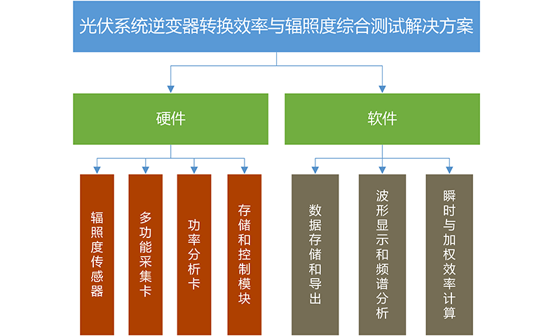 系統(tǒng)由硬件與軟件兩部分組成。硬件部分包括PXIe數(shù)據(jù)采集系統(tǒng)與輻照度傳感器。系統(tǒng)配備兩張功率分析板卡,可同步測(cè)量8路電壓與8路電流,覆蓋光伏陣列直流側(cè)與逆變器交流側(cè)的輸入/輸出功率;另配一張多功能采集卡,用于采集輻照度傳感器發(fā)出的信號(hào),并可按需擴(kuò)展溫度、應(yīng)變等模擬量,實(shí)現(xiàn)環(huán)境量與電參量一體化采集。所有通道依托 PXIe 背板統(tǒng)一時(shí)基,數(shù)據(jù)直接寫(xiě)入采集系統(tǒng)內(nèi)置的高速存儲(chǔ)模塊,確保長(zhǎng)時(shí)高頻測(cè)試數(shù)據(jù)完整、連續(xù),并支持實(shí)時(shí)波形查看、效率計(jì)算和頻譜分析。