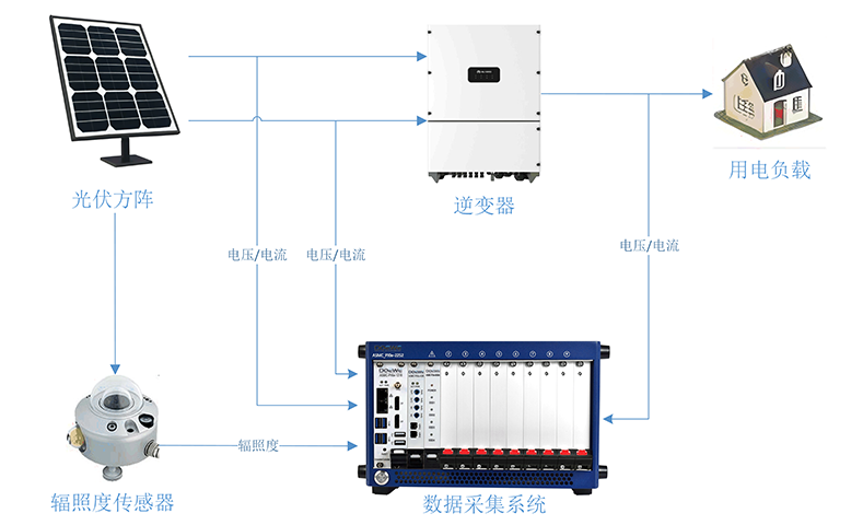 本方案聚焦光伏發(fā)電系統(tǒng)逆變器的轉(zhuǎn)換效率與輻照度特性。通過(guò)在直流側(cè)采集光伏方陣的電壓、電流與輻照度信號(hào),并同步監(jiān)測(cè)逆變器交流輸出端的電壓、電流與功率,數(shù)據(jù)采集系統(tǒng)能夠?qū)崟r(shí)計(jì)算瞬時(shí)轉(zhuǎn)換效率、I-V 曲線特性及功率損耗分布,幫助用戶評(píng)估逆變器在不同光照工況下的性能極限與能量利用率。系統(tǒng)對(duì) DC / AC 雙側(cè)電參量及光照強(qiáng)度的高精度同步采集,使測(cè)試人員能夠在戶外或?qū)嶒?yàn)室條件下,快速定位效率瓶頸、驗(yàn)證控制策略,并為組件選型和逆變器算法優(yōu)化提供可靠數(shù)據(jù)支撐。測(cè)試系統(tǒng)整體結(jié)構(gòu)圖如下: